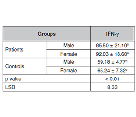 Background. Candida albicans is the most frequent etiologic agent that causes opportunistic fungal infection called candidiasis, a disease whose systemic manifestation could prove fatal and whose incidence is increasing as a result of an expanding immunocompromised population. Here we review the role of interferon-gamma (IFN-γ) in host protection against invasive candidiasis. This study investigates the time- and sex-dependent variations in IFN-γ levels in C.albicans-infected rats, offering insights into the function of this cytokine in fungal immunity. Materials and methods. This study involved 100 rats, with 50 in the experimental group and 50 in the control group, each consisting of 25 males and 25 females. The experimental group received cyclosporine A (10 mg) 24 hours prior to the infection to suppress the immune response and facilitate C.albicans growth, whereas the control group was administered distilled water instead of C.albicans suspension. Following four days of infection, group 1 was anesthetized, and a blood sample was collected to measure IFN-γ levels. Group 2 was assessed at 8 days, group 3 at 12 days, group 4 at 16 days, and group 5 at 20 days, alongside the control group. Results. The present study demonstrated a significant increase (p < 0.05) in IL-10 concentration in both male and female rats infected with C.albicans compared to the control group. There was a significant increase in IFN-γ concentration in C.albicans-infected rats of both sexes, with a p value < 0.05, with progression of disease; the highest concentration was reached on the 12th day of the experiment and then decline. In contrast, no significant changes were observed in the control group over the same period. Conclusions. The research highlights the essential function of IFN-γ in the immune response to Candida albicans infections, observing that the absence of notable differences between male and female rats suggests that additional factors affect IFN-γ regulation. The necessity for additional research on the interactions between sex hormones and cytokines is underscored, offering insights into the sex- and time-dependent regulation of IFN-γ during infections, while also highlighting the need for clarification of observed discrepancies and their underlying mechanisms.